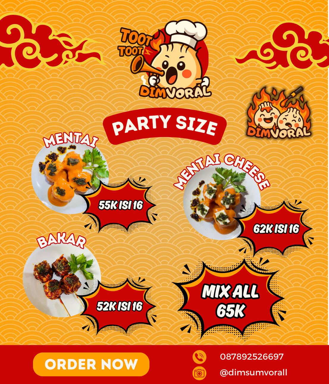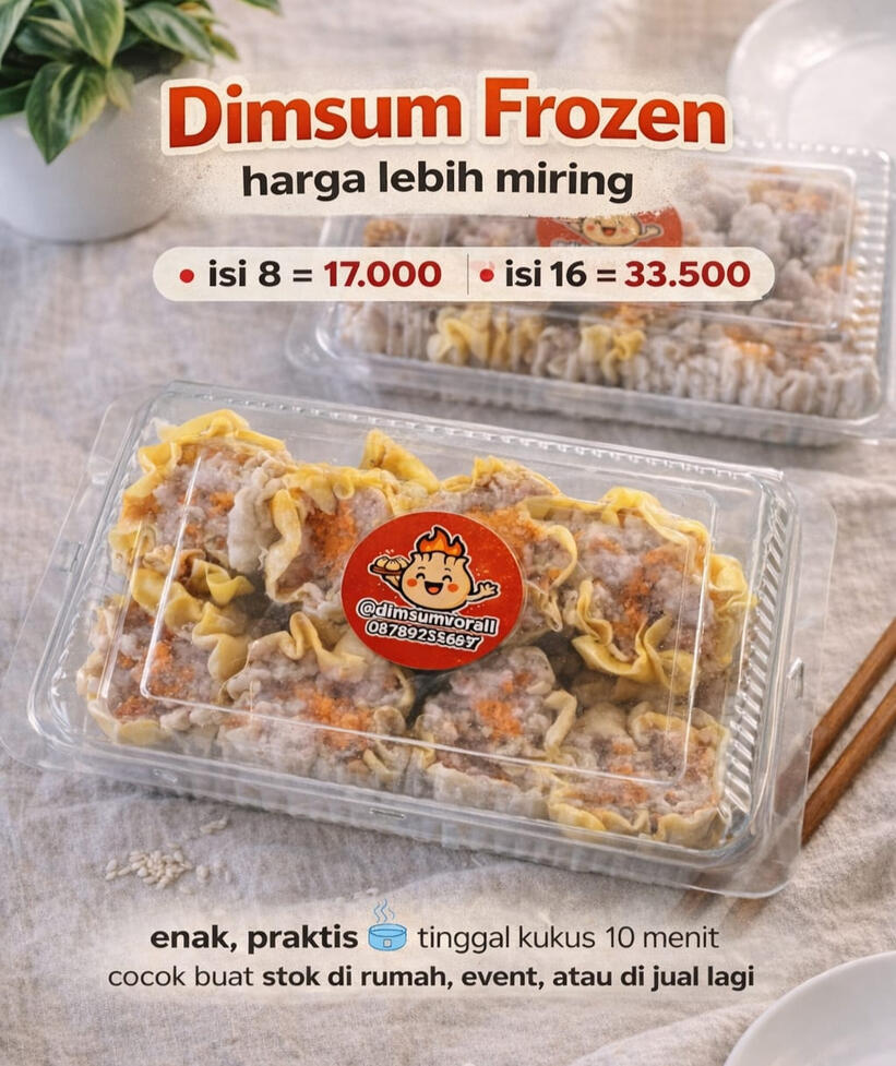 Kami menyediakan dimsum frozen yang cocok untuk stok konsumsi di rumah, kebutuhan acara, maupun sebagai bahan untuk supplier. Tersedia juga opsi PENAMBAHAN SAOS MENTAI yang dapat dikemas secara terpisah sesuai kebutuhan, dan dapat dikonsultasikan terlebih dahulu.Harga dimsum frozen lebih ekonomis dibandingkan harga reguler. Selain itu, kami memberikan penawaran khusus berupa potongan harga untuk pemesanan dalam jumlah besar, sehingga lebih menguntungkan untuk kebutuhan pribadi maupun usaha.
